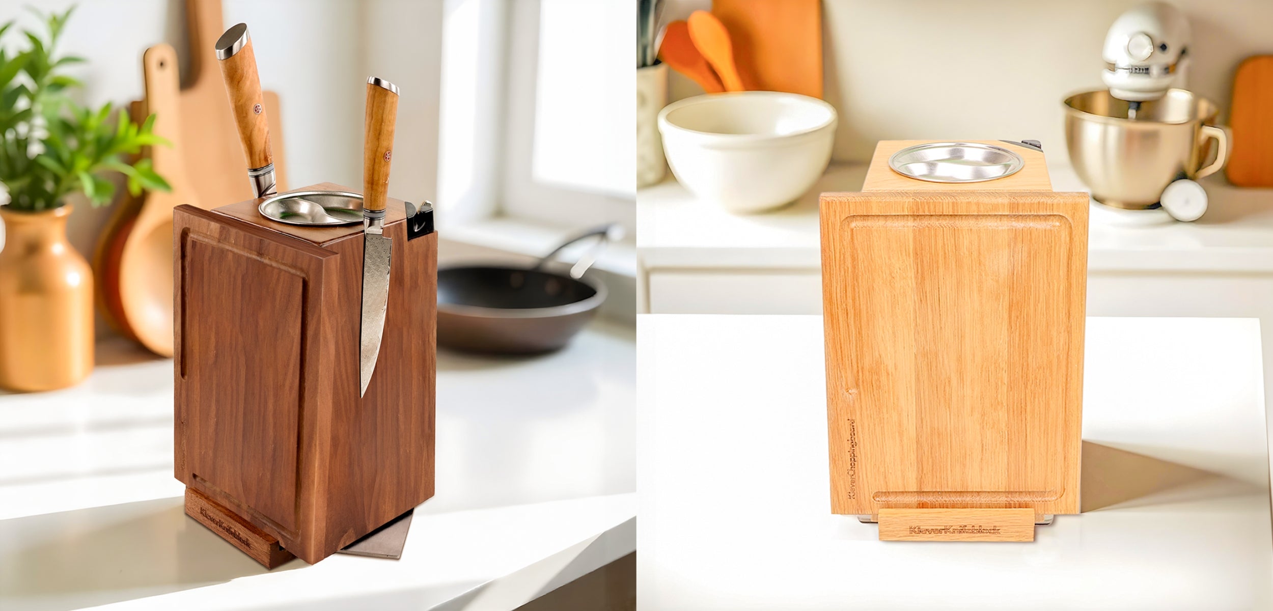 The KleverChef is the ultimate kitchen solution with 360° magnetic surfaces for knives, a cutting board holder, built-in sharpener, and a multifunctional top tray. Crafted from walnut or oak hardwood, it’s stylish, durable, and designed to keep your kitchen organized and bacteria-free.